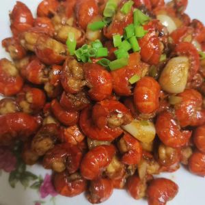 热油下生姜、蒜头,倒入处理好的虾球,加料酒、盐、老抽、清水翻炒片刻,起锅盛盘(喜欢甜食的朋友最后一步可以加少许糖调味,反之爱吃辣的朋友,烧时可以放点辣椒在里面)