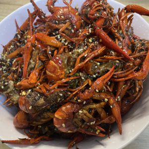 下酱料的图片忘记拍了,下入酱料后放老抽、生抽(因为我今天龙虾比较多燕尾稍淡所以加了生抽),一起翻炒均匀后先加入啤酒用中火焖煮10-15分钟,待焖煮结束过后揭开锅盖转大火收汁,出锅前放入红油辣椒翻拌均匀(因为调料不够辣,哈哈)就可以开动了
