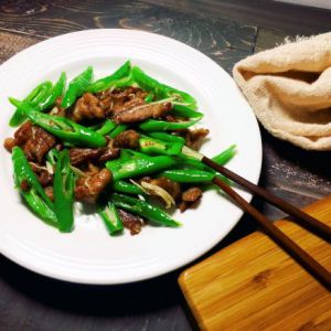 油倒入炒锅中,加热到七成热时下入肉条(用手感觉到很热,但油没冒烟),过油滑散后快速出锅。锅中留些余油,加热后倒入姜丝爆香,再放入青椒煸炒1~2分钟,倒入肉条大火快速翻炒,适当的撒点盐,让青椒带点味儿,出锅装盘。