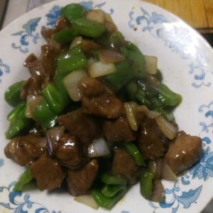 锅热后放入油,油温至7成热放入姜片煸炒几下,放入腌制好的牛肉炒至断生,放入洋葱、青椒、继续煸炒,炒至七成熟时放入蒜末、糖、蚝油、盐继续煸炒,炒熟后放入水淀粉再煸炒半分钟出锅即可。