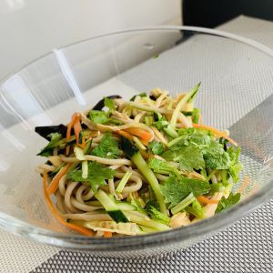 然后把准备好的配菜、面条、鸡丝放在一起,加入调味,我的习惯是2勺生抽1勺醋,少许白糖食盐,一小勺蚝油还有芝麻,搅拌均匀装盘即可