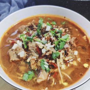 把捞起来的肉片放在蔬菜上,倒入适量汤汁,可适当搅动一下,撒上辣椒面和蒜蓉。
