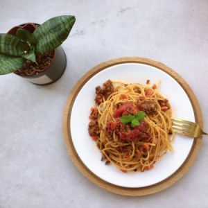 锅里热油,放入牛肉末炒至变色。依次加入蒜、胡萝卜、芹菜、洋葱,炒至洋葱变透明。再加入盐、黑胡椒、番茄膏、牛奶、白葡萄酒、百里香、月桂叶,大火烧至沸腾,加入碎番茄,搅拌均匀,小火保持沸腾,熬30-40分钟,起锅。肉酱做好。