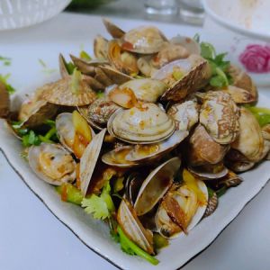 起锅烧油,葱姜蒜干辣椒暴香,加入煮好的花蛤翻炒,再加入两勺生抽,一勺豆瓣酱,翻炒均匀即可