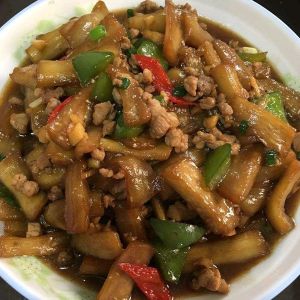 1茄子去皮城成四厘未长条,葱姜蒜分别切成粒,青红椒切好待用。