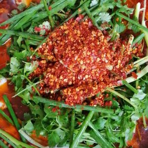 4.起锅后的鱼上铺上事先准备好的葱段,香菜,干辣椒面,干花椒粒,同时锅里再倒入油烧至冒烟,最后将热油倒入辣椒面上,香味扑鼻而来,就可以开吃啦