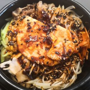 石锅内刷一层油,放入剩米饭压平整,这样会有锅巴好吃,将所有菜码放好,鸡蛋放中间,最后淋入酱汁即可