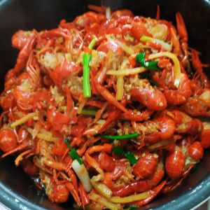 炒料:烧油加豆瓣酱、大蒜丶姜丝丶干辣椒丶小米椒、八角、桂皮、香叶、花椒丶麻椒炒出香味加入炸好的龙虾,加盐,鸡精翻炒入味,到入啤酒盖上锅盖。