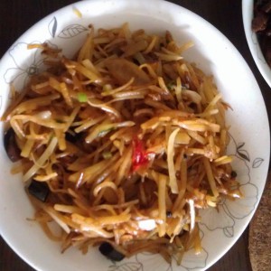 倒入土豆丝,掂锅翻炒几下 放蒜