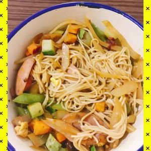 最后放入煮熟的面条和鸡蛋碎,加入老抽,生抽,糖,醋,盐调味,加清水烧制两分钟即可出锅。