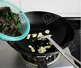 12、炒至香味四溢时,倒入紫苏稍炒几下。