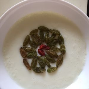 开水烧开后入锅(加盖)蒸10分钟,关火闷5分钟后取出,牛奶已凝固,表面放上葡萄干和枸杞子,凉后入冰箱。