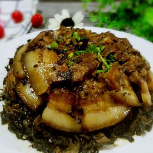在刚才煎肉的锅中下少许蒜末,大火爆香,把梅干菜末下入翻炒,放适量盐和生抽,加大半碗清水,盖盖焖,焖至水快干时加少许白糖收汁关火。