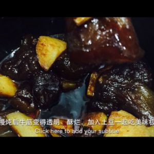 水开了以后撇去浮沫,盖上盖子小火慢炖,两三个小时后牛筋变得酥烂、透明非常诱人,可以加入各种配菜:土豆、萝卜或是芋头再煮至配菜入味