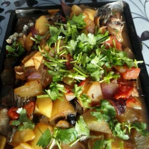 鱼也烤好了,菜带汤汁熬到粘稠倒入烤盘,在放烤箱烤10分钟左右