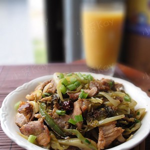 锅中再倒入油,把肉片煎香至表面金黄色,加盐、酱油继续翻炒