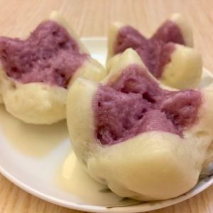 把紫薯面团包入白面团中,搓圆,上边用刀划一个十字,进行二次发酵