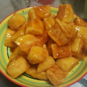 熬糖:小火,锅烧热,先放一勺油,油温上升点,再放三勺糖,糖放进锅里,不停地用筷子搅拌,直到糖熬的冒出泡泡,快速搅拌一下,把炸好的山药块儿倒进锅里,翻炒一下,让每个山药块儿都沾上糖,出锅即可。