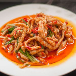 锅中留油炒制剁椒和豆瓣酱,炒干水分后放肉丝,加少许盐撒上葱节即可。