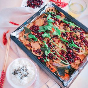 把煮好的菜淋到烤盘里和烤鱼上,空隙的地方多放点菜哦,继续放入烤箱200度烤30分钟