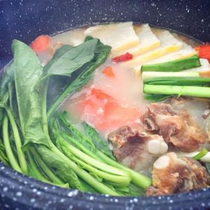 大火煮沸,转小火煮30分钟后依次放入切片的鱼糕、菠菜和蒜段,大功告成完成啦。