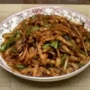 五花肉切丝,放料酒,水淀粉,面,蛋清抓匀。