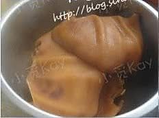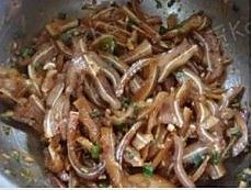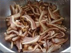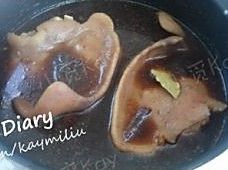 冷水中加入自家卤川味卤料、香叶、八角、桂皮、生姜片、料酒、盐、老抽,放入猪耳朵卤半小时左右。