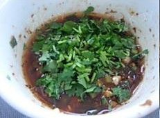 用蒜末、葱花、香菜末、蚝油、花椒油、香醋、糖、自制辣椒油调汁,