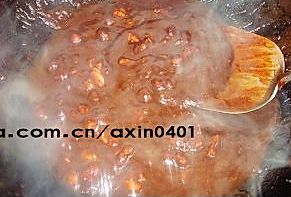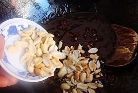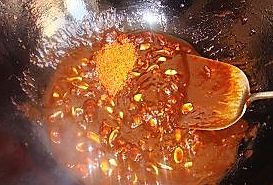 将熟花生米也一起倒入翻炒,酱煮开后倒入辣椒粉,