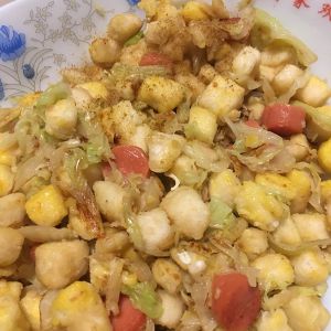 加入火腿肠翻炒出锅,撒点孜然