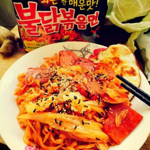 煮面的时候放年糕一起煮然后炒起来 完全就是辣年糕拉面 好吃