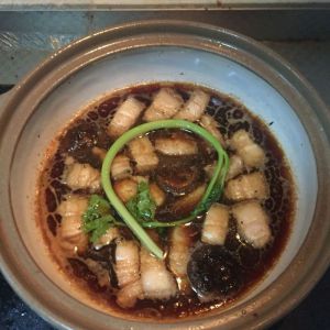 将炒好的五花肉和油一并倒入紫砂锅,倒入水、老抽,水没过猪肉即可。放入香菇和香芹提香。开大火煮沸后,盖上盖子,换小火炖30分钟。