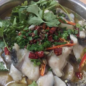 准备好盆子,将鱼骨和酸菜捞出放入,此时鱼汤已经成雪白色,把剩余的鱼片倒入鱼汤中,大火煮两分钟,鱼片已经成白色,将鱼汤一同倒入装好鱼骨的盆中,此时将干辣椒、朝天椒、花椒、香葱末撒在鱼上面,锅洗净,再倒入适量油,将油淋在上面,此时飘香四溢!美味的酸菜鱼就做好了!