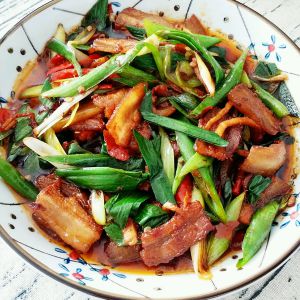 锅中热油,放入五花肉煸炒,炒出油份,有点微焦最好,然后加入姜片,郫县豆瓣酱翻炒,加入料酒翻炒,加青蒜和青红椒,快速翻炒,翻炒一分钟加盐,酱油,糖,翻炒两分钟出锅即可。