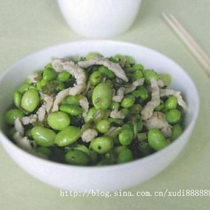 另起锅放油,油温后下毛豆仁煸炒,然后下雪菜炒几下,加入少许清水,调入糖和鸡精,大火煮2分钟;