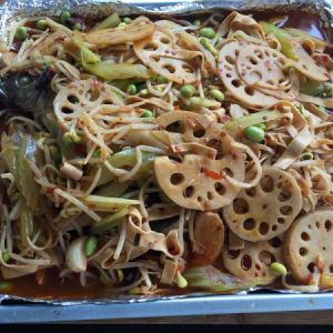 30分钟烤鱼时,炒配菜,图漏了,倒入烧多的油,把准备的葱姜蒜,干辣椒,翻炒,加入豆瓣酱,加白糖,老抽,生抽,炒出红油,再放入配菜,难熟的先放,再加热水。炒完后再撒在烤好的鱼身周围,连汤汁,一起倒入,再烤10分钟,最后撒上香菜,美味就好了!