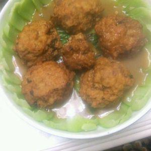 锅内倒入少量油,放入葱姜爆香加水,放入炸好的肉丸,放入适量酱油、盐, 调味调色~ 大火炖开,转小火,炖四十分钟左右。