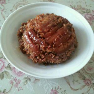 拌好的肉片码到蒸碗里,蒸制2小时,取出倒扣到盘子里,开吃。