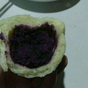 把蒸好的紫薯去皮,用勺子撵烂,或加入一勺蜂蜜(也可不加),用手捏成圆球状。