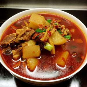 锅中放油盐,大蒜、姜丝、干红辣椒、桂皮草果八角炒香,把牛腩倒入锅中一起翻炒至肉色焦黄。