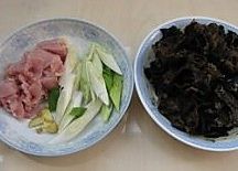抓一把干木耳,用水泡上。如果您特着急赶着做菜,可以用温水泡发。泡好的木耳多换几遍水,去根去杂质。清洗干净,掰成小朵。