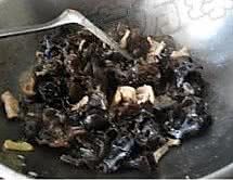 木耳下锅翻炒至出现劈啪声,然后下葱段,最后加酱油和盐调味,出锅前淋入水淀粉勾薄芡即可。水淀粉勾芡很重要,最后盛盘的木耳明亮光滑,口感好。