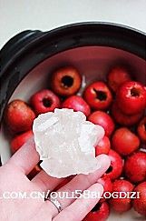 去核的山楂,放入砂锅里,放入老冰糖(老冰糖又称多晶冰糖,比那种普通的单晶冰糖好太多,中药里要用的就是这种,如果喜欢吃酸点的,可以少放点冰糖)