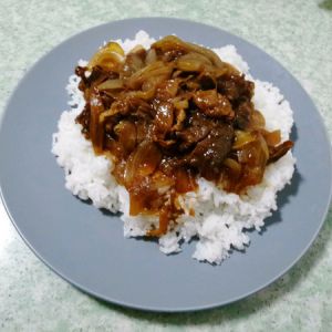 锅中放入少许植物油,不然会很腻。放洋葱炒软后,加入少许热水,洋葱会出水,所以不用放太多水,加入生抽、老抽、蚝油和鸡精,如此就可以不放盐了。