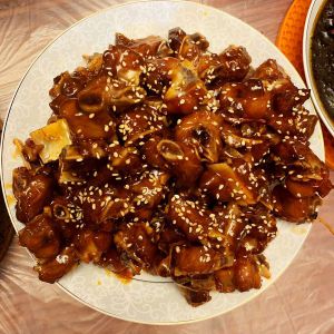 为做年夜饭,特选肉多小排,用黄酒、姜片、盐和酱油腌制小排30分钟