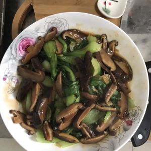 最后将香菇连同酱汁一同倒入油菜上,一盘香菇油菜就做好啦。
