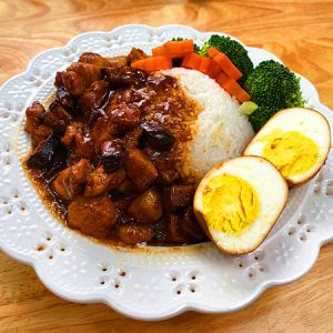 10、配上蒸好的米饭,淋上酱汁,摆上切好的卤蛋,大功告成