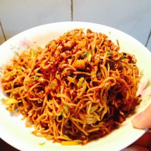 然后把调好的酱油,醋,甜酱,糖,花椒等加入面条中一起翻炒(注意一定要炒匀)、等到快炒好时再加入葱花和胡椒粉