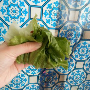 生菜冼净用盐水泡10分钟,青椒,蒜切成小块。