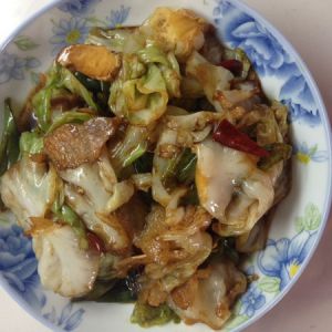 锅入油下入葱姜干红椒大蒜头,前面调料忘说大蒜头了,小火爆出香味下入少量腊肉片,因为只是提味的作用,不用放很多,翻炒几下,肥肉变透明就行,加入少量生抽,红烧酱油翻炒出酱油香,再把包菜和青椒加入,放适量蚝油提鲜,少量盐,因为腊肉和调料都有咸会,不能放太多盐了,包菜本身会出水,盖上锅盖中火闷3分钟左右,中间打开观察不要水干了,如果太干可以少滴点水进去,看到包菜叶子软软的就差不多了